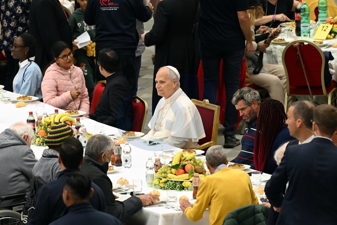 Pope Leo XIV attends a lunch with the poor on the occasion of the Jubilee of the Poor and the 9th World Day of the Poor inside the Paul VI Hall, Vatican City, 16 November 2025., Credit:Maria Laura Antonelli / Avalon