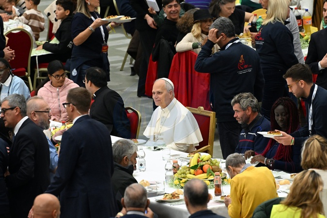 Pope Leo XIV attends a lunch with the poor on the occasion of the Jubilee of the Poor and the 9th World Day of the Poor inside the Paul VI Hall, Vatican City, 16 November 2025., Credit:Maria Laura Antonelli / Avalon