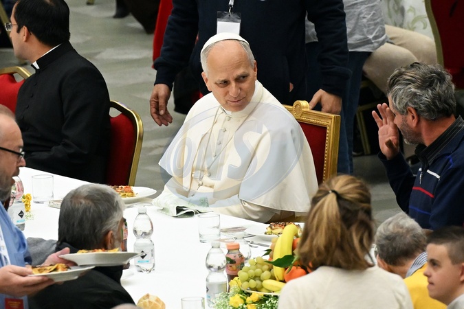 Pope Leo XIV attends a lunch with the poor on the occasion of the Jubilee of the Poor and the 9th World Day of the Poor inside the Paul VI Hall, Vatican City, 16 November 2025., Credit:Maria Laura Antonelli / Avalon