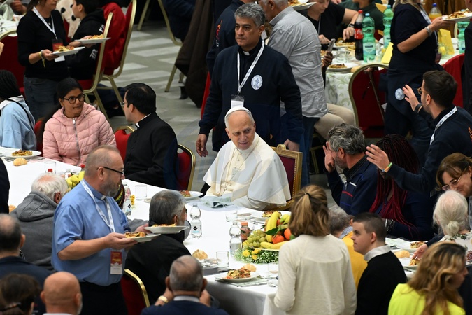 Pope Leo XIV attends a lunch with the poor on the occasion of the Jubilee of the Poor and the 9th World Day of the Poor inside the Paul VI Hall, Vatican City, 16 November 2025., Credit:Maria Laura Antonelli / Avalon