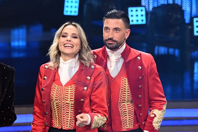 Rai1. Television program "Dancing with the Stars," twentieth edition. Pictured is Milly Carlucci with Francesca Fialdini, who is injured and unable to dance due to fractures, with maestro Giovanni Pernice. Rome, Nov 15th 2025, Credit:Maria Laura Antonelli / Avalon
