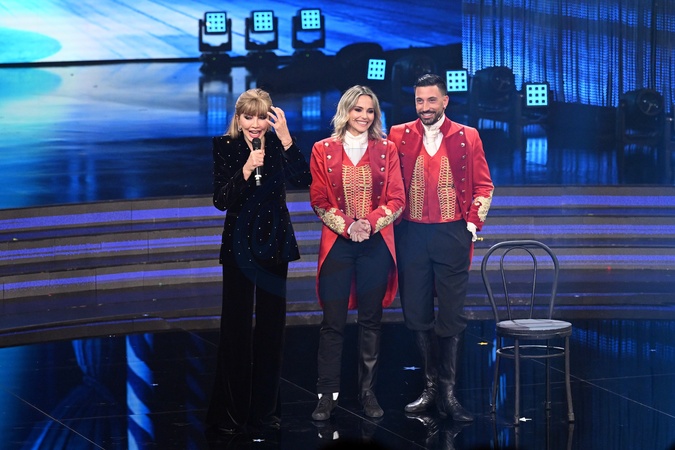 Rai1. Television program "Dancing with the Stars," twentieth edition. Pictured is Milly Carlucci with Francesca Fialdini, who is injured and unable to dance due to fractures, with maestro Giovanni Pernice. Rome, Nov 15th 2025, Credit:Maria Laura Antonelli / Avalon