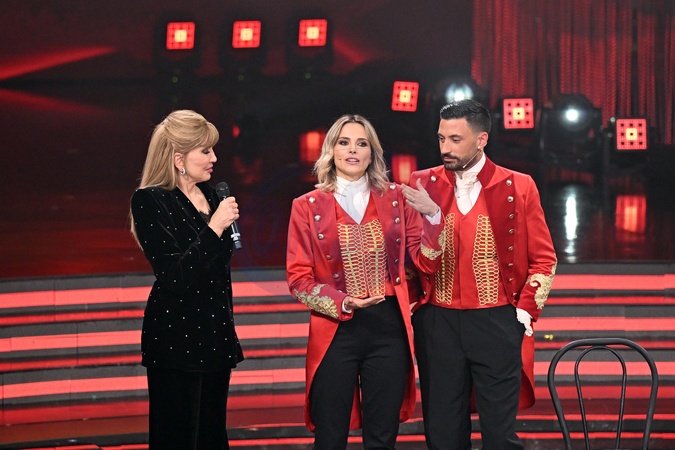 Rai1. Television program "Dancing with the Stars," twentieth edition. Pictured is Milly Carlucci with Francesca Fialdini, who is injured and unable to dance due to fractures, with maestro Giovanni Pernice. Rome, Nov 15th 2025, Credit:Maria Laura Antonelli / Avalon
