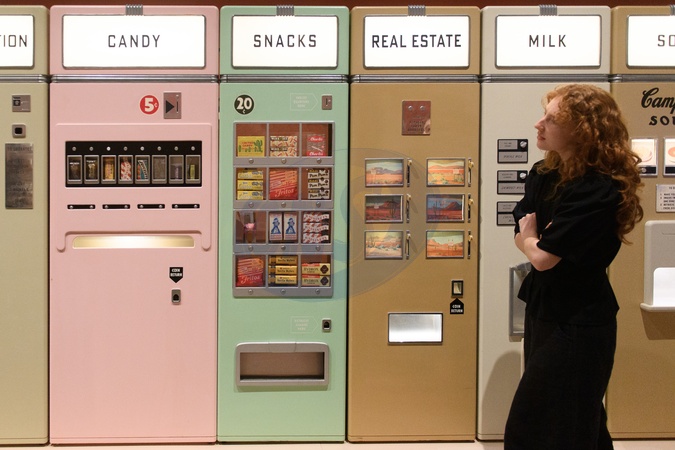 A staff member views A bank of Vending Machines created for 'Asteroid City' by Atelier Simon Weisse and Erica Dorn (2021) at a photocall for The Design Museum's 'Wes Anderson: The Archives' Exhibition at The Design Museum in London, England, UK on Monday 17 November 2025. The exhibition runs from 21 November 2025 - 26 July 2026., Credit:Justin Ng / Avalon