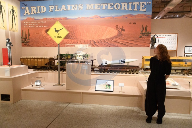 A staff member views Props created for 'Asteroid City' at a photocall for The Design Museum's 'Wes Anderson: The Archives' Exhibition at The Design Museum in London, England, UK on Monday 17 November 2025. The exhibition runs from 21 November 2025 - 26 July 2026., Credit:Justin Ng / Avalon