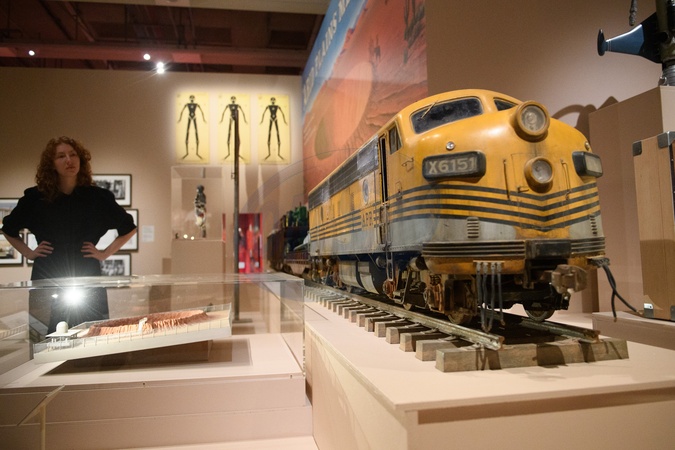 A staff member views Props created for 'Asteroid City' at a photocall for The Design Museum's 'Wes Anderson: The Archives' Exhibition at The Design Museum in London, England, UK on Monday 17 November 2025. The exhibition runs from 21 November 2025 - 26 July 2026., Credit:Justin Ng / Avalon