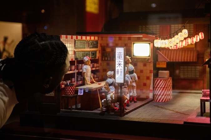 A staff member views Noodle Bar Set with Boss, baseball team and coach, and chef puppets at a photocall for The Design Museum's 'Wes Anderson: The Archives' Exhibition at The Design Museum in London, England, UK on Monday 17 November 2025. The exhibition runs from 21 November 2025 - 26 July 2026., Credit:Justin Ng / Avalon