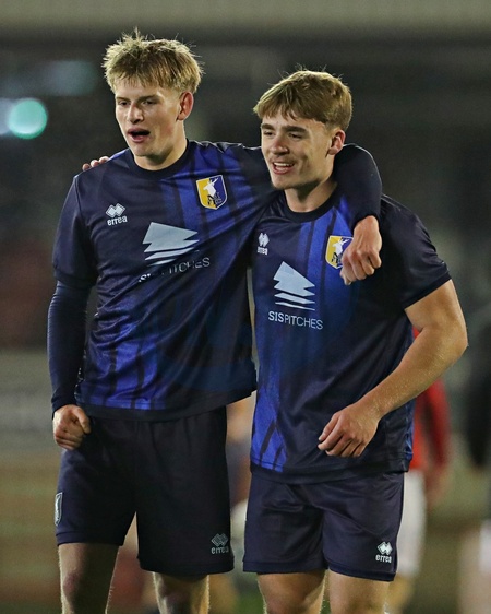 Louis Spink and Charlie Cheetham of Mansfield Town U18's celebrate after the FA Youth Cup U18's round 2 match Barnsley vs Mansfield Town at Oakwell, Barnsley, United Kingdom, 17th November 2025, Credit:Sam Eaden/News Images / Avalon