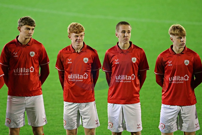 Max Rayner of Barnsley FC U18's, Josh Hayes of Barnsley FC U18's, Tayo Dunne of Barnsley FC U18's and Robson Woodcock of Barnsley FC U18's before the FA Youth Cup U18's round 2 match Barnsley vs Mansfield Town at Oakwell, Barnsley, United Kingdom, 17th November 2025, Credit:Sam Eaden/News Images / Avalon