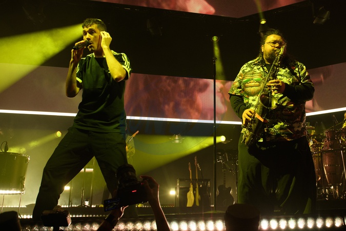 Lead singer Dan Smith and guest Saxophone player of English indie pop band Bastille performs at O2 Arena, London, England, UK on Tuesday 18 November 2025 as part of their "From All Sides" 2025 Tour., Credit:Justin Ng / Avalon