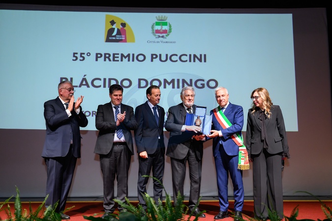 Opera singer Plácido Domingo receives the 2025 Puccini Award from Mayor Giorgio Del Gingaro, President of the Puccini Festival Fabrizio Miracolo, and artistic director Angelo Taddeo in the Caruso Auditorium of the Gran Teatro Giacomo Puccini in Torre del Lago. Viareggio, Italy 18 November 2025, Credit:Stefano Dalle Luche / Avalon
