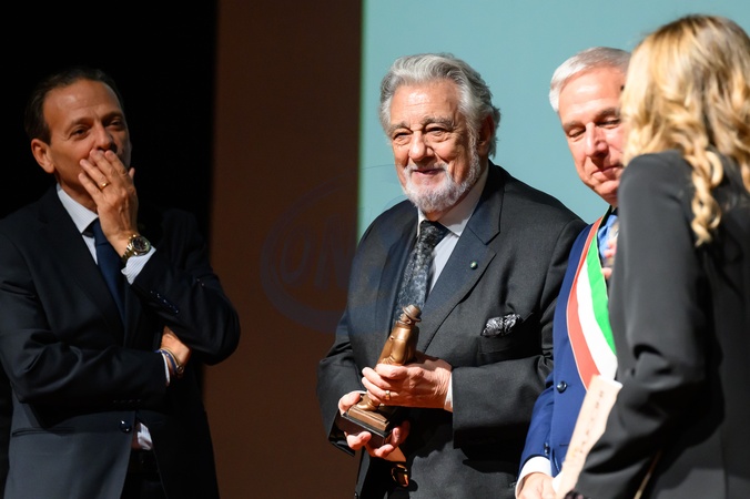 Opera singer Plácido Domingo receives the 2025 Puccini Award from Mayor Giorgio Del Gingaro, President of the Puccini Festival Fabrizio Miracolo, and artistic director Angelo Taddeo in the Caruso Auditorium of the Gran Teatro Giacomo Puccini in Torre del Lago. Viareggio, Italy 18 November 2025, Credit:Stefano Dalle Luche / Avalon