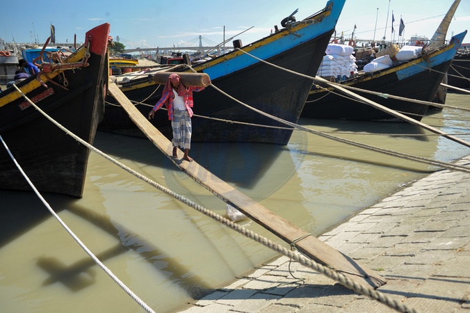Chattogram, Bangladesh: A worker carries a heavy gas cylinder on his shoulder from a boat at the Karnaphuli River, highlighting the city's daily riverine labor., Credit:Md Rafayat Haque Khan / Avalon