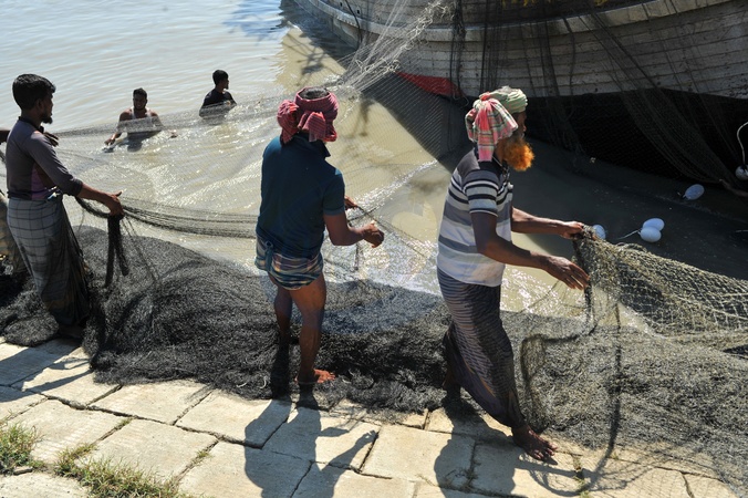 Chattogram, Bangladesh: After 10 days of deep-sea fishing in the Bay of Bengal, fishermen pack and repair their nets along the banks of the Karnaphuli River., Credit:Md Rafayat Haque Khan / Avalon