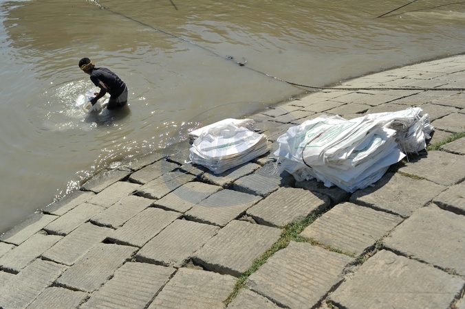 Chattogram, Bangladesh: A worker washes chemical powder used plastic bags in the waters of the Karnaphuli River for reuse, highlighting the ongoing challenges of informal recycling practices and river contamination., Credit:Md Rafayat Haque Khan / Avalon