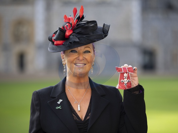 Image Licensed to i-Images Picture Agency. 19/11/2025. Windsor , United Kingdom. Charlotte Charles, the mother of motorcyclist Harry Dunn, with her MBE after an Investiture at Windsor Castle, United Kingdom., Credit:Stephen Lock / i-Images / Avalon