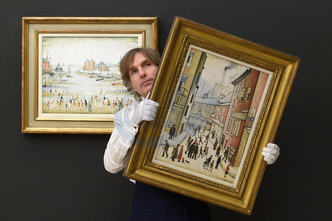 A technician holds up (L) - 'The Estuary' by L.S. Lowry (Laurence Stephen Lowry) (est. £700k - £1m) and (R) - 'An Old Street' by L.S. Lowry (Laurence Stephen Lowry) (est. £800k - £1.2m) and which is to go on auction at Sotheby's Modern British and Irish Art Evening Auction on 25th November 2025 at Sotheby's, London, England, UK on Wednesday 19 November, 2025., Credit:Justin Ng / Avalon
