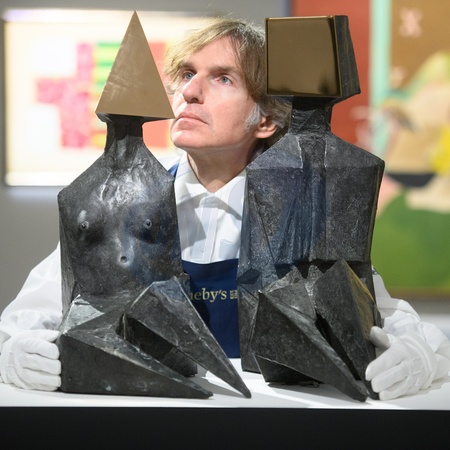 A staff member views 'Pair of Sitting Figures VI' by Lynn Chadwick (est. £100k - £150k) which is to go on auction at Sotheby's Modern British and Irish Art Evening Auction on 25th November 2025 at Sotheby's, London, England, UK on Wednesday 19 November, 2025., Credit:Justin Ng / Avalon