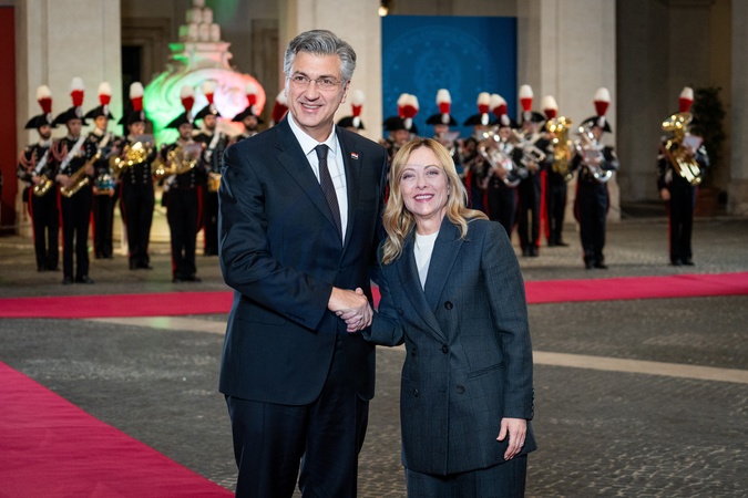 Italian Prime Minister Giorgia Meloni receives the Prime Minister of the Republic of Croatia, Andrej Plenković, at Palazzo Chigi in Rome, Italy, on 19 November 2025.