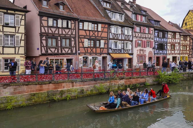 France, Alsace region, Colmar, Little Venice surrounded by Lauch River, it is a picturesque tourism old, district of Krutenau, in the southern suburb of the historic center of Colmar - Tourists in river boat on sightseeing tripPhoto Fabio Mazzarella/Sintesi *** Local Caption ***, Credit:Fabio Mazzarella / Avalon