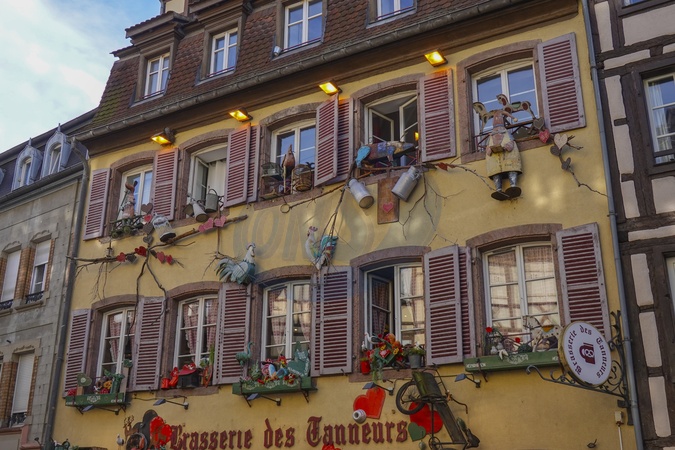 France, Alsace region, Colmar, Particular germanic colourful restaurant with heart decoration on its facadePhoto Fabio Mazzarella/Sintesi *** Local Caption ***, Credit:Fabio Mazzarella / Avalon