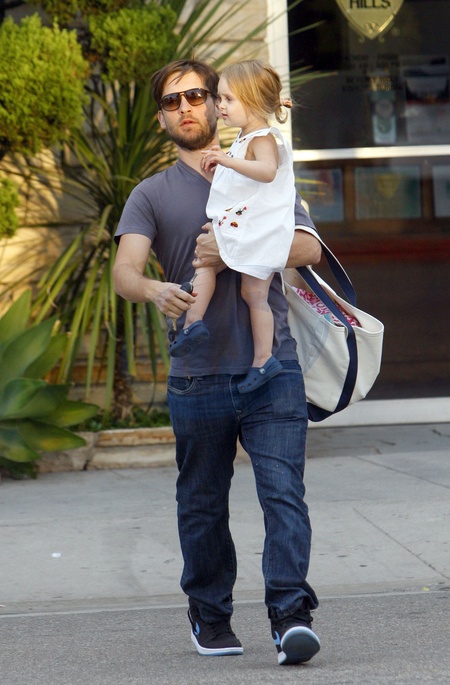 Tobey Maguire z corka Ruby Sweetheart wracaja ze sklepu 'Color Me Mine', Beverly Hills