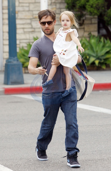 Tobey Maguire z corka Ruby Sweetheart wracaja ze sklepu 'Color Me Mine', Beverly Hills
