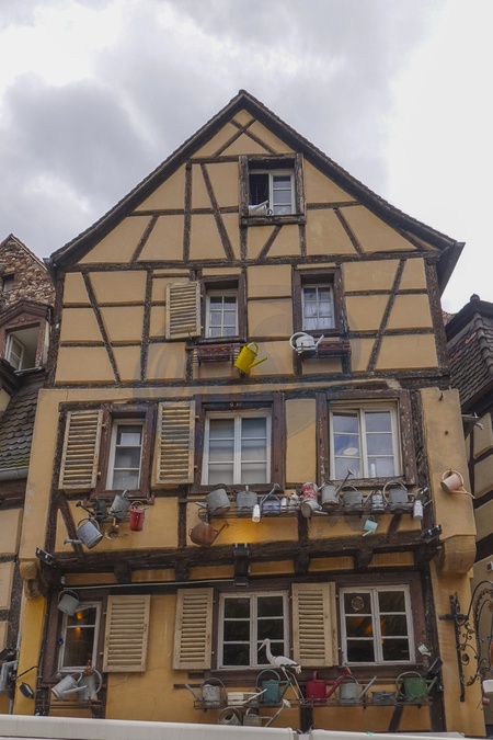 France, Alsace region, Colmar, Facades of historic half-timbered houses decorated with watering cans in the old town centre of ColmarPhoto Fabio Mazzarella/Sintesi *** Local Caption ***, Credit:Fabio Mazzarella / Avalon