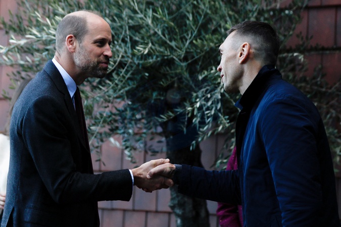 Britain's Prince William, Prince of Wales is welcomed by rugby union coach Kevin Sinfield, as he visits the Rob Burrow Centre for Motor Neurone Disease, named after late rugby league player Rob Burrow CBE, at Seacroft Hospital, in Leeds, Britain, November 20, 2025., Credit:Temilade Adelaja / Avalon