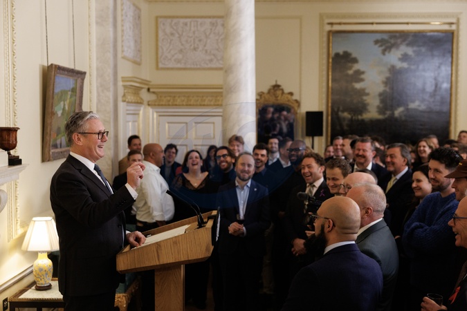 19/11/2025. London, United Kingdom. Prime Minister Keir Starmer speaks with footballers Jamie Carragher and Connor Coady as he attends a reception in 10 Downing Street to celebrate International Men's Day, Credit:Simon Dawson / Avalon