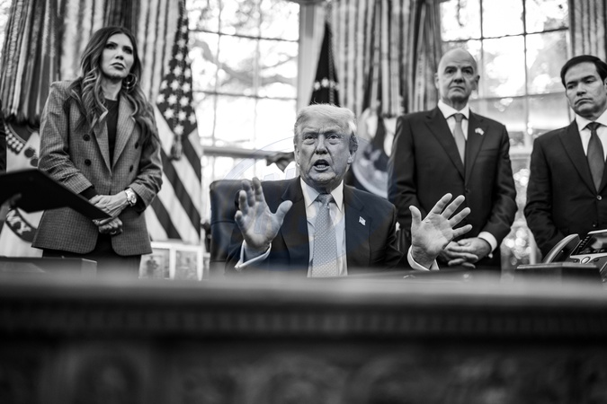 President Donald Trump answers questions from members of the media after meeting with the White House Task Force on the 2026 FIFA World Cup, Monday, November 17, 2025, in the Oval Office., Credit:Daniel Torok / Avalon
