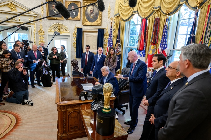 President Donald Trump answers questions from members of the media after meeting with the White House Task Force on the 2026 FIFA World Cup, Monday, November 17, 2025, in the Oval Office., Credit:Joyce N. Boghosian / Avalon