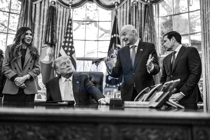 President Donald Trump looks on as FIFA President Gianni Infantino addresses members of the media, Monday, November 17, 2025, in the Oval Office., Credit:Daniel Torok / Avalon