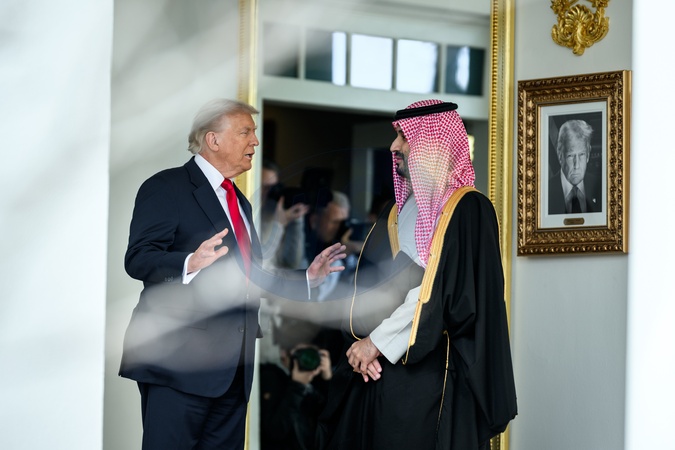 President Donald Trump and Crown Prince and Prime Minister Mohammed bin Salman Al Saud of Saudi Arabia speak on the West Colonnade of the White House, Tuesday, November 18, 2025., Credit:Daniel Torok / Avalon