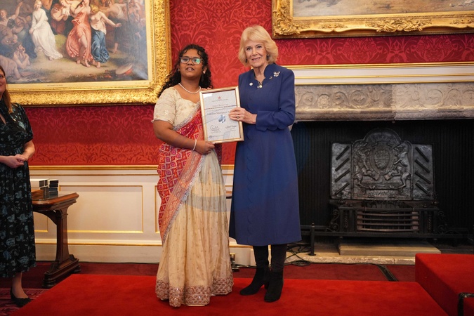 Queen Camilla presents Junior Runner Up, Lakshmi Manognya Achanta, 14, from Singapore, with a certificate, during a reception to celebrate the winners of the Queen's Commonwealth Essay Competition at St James' Palace in London. Picture date: Thursday November 20, 2025., Credit:Yui Mok / Avalon