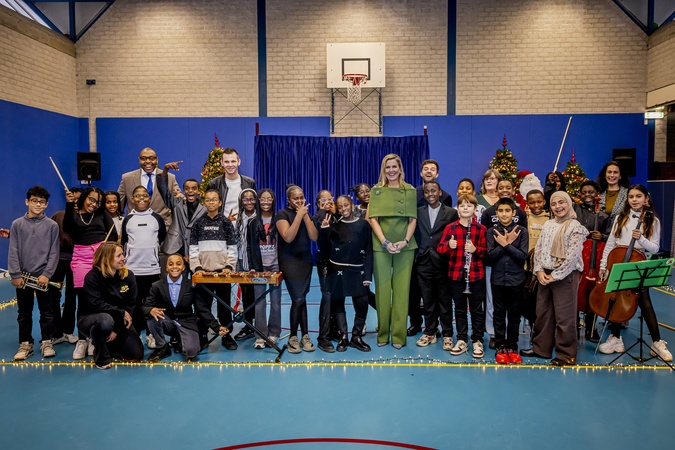 Amsterdam, The Netherlands, 2025-11-20 14:32:02AMSTERDAM, 20-11-2025, Mobiel Primary School. Queen Máxima, honorary chair of More Music in the Classroom, visited Mobiel Primary School in Amsterdam. Mobiel Primary School is one of twelve primary schools participating in the largest school band in the Netherlands. The school band performs during the annual Christmas Music Gala, which raises awareness of the importance of music and creative education. PHOTO: NLBeeld/POOL/Patrick van Katwijk, Credit:Avalon