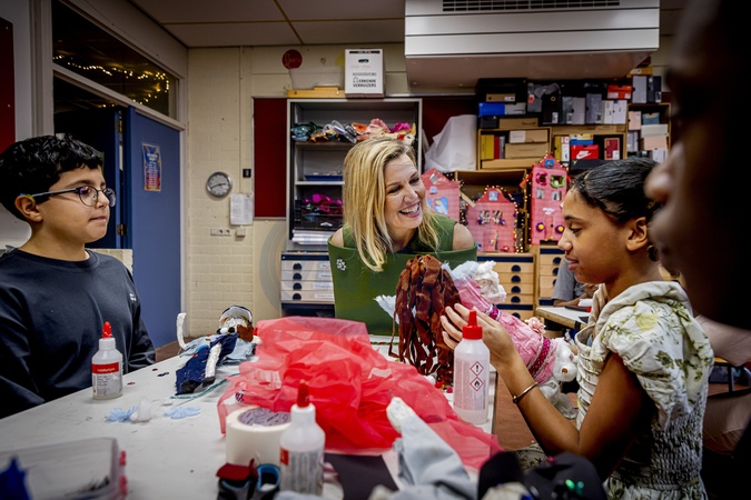 Amsterdam, The Netherlands, 2025-11-20 14:40:35AMSTERDAM, 20-11-2025, Mobiel Primary School. Queen Máxima, honorary chair of More Music in the Classroom, visited Mobiel Primary School in Amsterdam. Mobiel Primary School is one of twelve primary schools participating in the largest school band in the Netherlands. The school band performs during the annual Christmas Music Gala, which raises awareness of the importance of music and creative education. PHOTO: NLBeeld/POOL/Patrick van Katwijk, Credit:Avalon