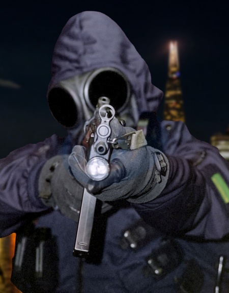 Digitally layered images of firearms officer , with added London backgrounds, representing the added pressure and danger London's Police officers now face. London. UK.