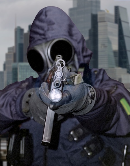 Digitally layered images of firearms officer , with added London backgrounds, representing the added pressure and danger London's Police officers now face. London. UK.