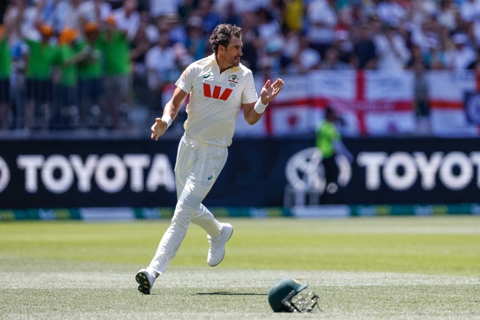 Mitch Starc of Australia celebrates the wicket of Zak Crawley of England during the NRMA Insurance Ashes First Test Day 1 Series Australia vs England at Optus Stadium, Perth, Australia, 20th November 2025, Credit:Santanu Banik/News Images / Avalon