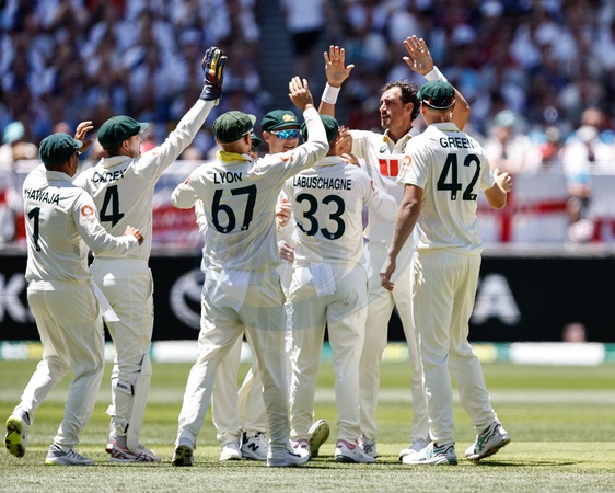 Mitch Starc of Australia celebrates the wicket of Joe Root of England with team mates during the NRMA Insurance Ashes First Test Day 1 Series Australia vs England at Optus Stadium, Perth, Australia, 20th November 2025, Credit:Santanu Banik/News Images / Avalon