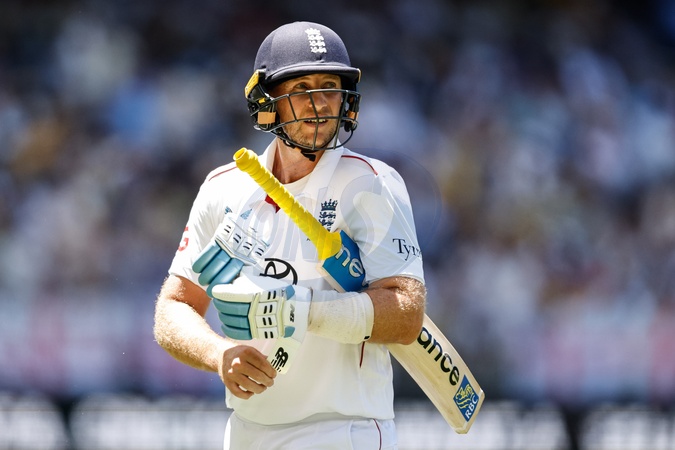 A dejected Joe Root of England leaves the field of play after been dismissed after he's caught out by Marnus Labuschagne of Australia during the NRMA Insurance Ashes First Test Day 1 Series Australia vs England at Optus Stadium, Perth, Australia, 20th November 2025, Credit:Santanu Banik/News Images / Avalon