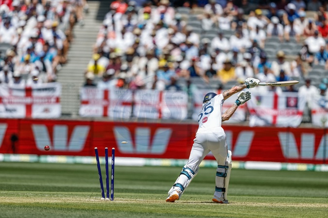 England captain Ben Stokes is bowled out by Mitch Starc of Australia during the NRMA Insurance Ashes First Test Day 1 Series Australia vs England at Optus Stadium, Perth, Australia, 20th November 2025, Credit:Santanu Banik/News Images / Avalon
