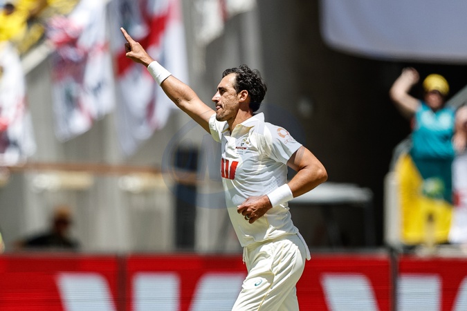 Mitch Starc of Australia celebrates the wicket of England captain Ben Stokes during the NRMA Insurance Ashes First Test Day 1 Series Australia vs England at Optus Stadium, Perth, Australia, 20th November 2025, Credit:Santanu Banik/News Images / Avalon