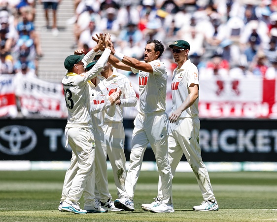 Mitch Starc of Australia celebrates the wicket of England captain Ben Stokes with team mates during the NRMA Insurance Ashes First Test Day 1 Series Australia vs England at Optus Stadium, Perth, Australia, 20th November 2025, Credit:Santanu Banik/News Images / Avalon