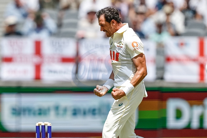 Mitch Starc of Australia celebrates the wicked of Gus Atkinson of England and makes it his fifth wicket of the innings during the NRMA Insurance Ashes First Test Day 1 Series Australia vs England at Optus Stadium, Perth, Australia, 20th November 2025, Credit:Santanu Banik/News Images / Avalon