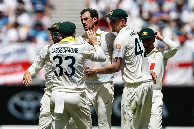Mitch Starc of Australia celebrates the wicket of Gus Atkinson of England and makes it his fifth wicket of the innings with team mates during the NRMA Insurance Ashes First Test Day 1 Series Australia vs England at Optus Stadium, Perth, Australia, 20th November 2025, Credit:Santanu Banik/News Images / Avalon