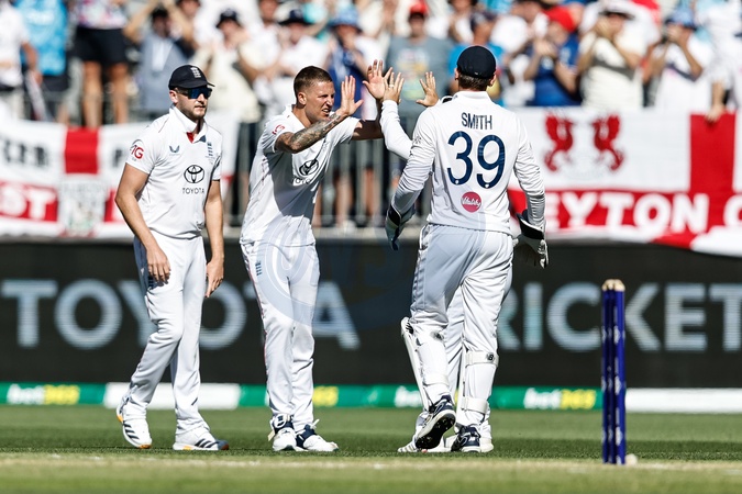 Brydon Carse of England celebrates the wicket of Australia captain Steve Smith during the NRMA Insurance Ashes First Test Day 1 Series Australia vs England at Optus Stadium, Perth, Australia, 20th November 2025, Credit:Santanu Banik/News Images / Avalon