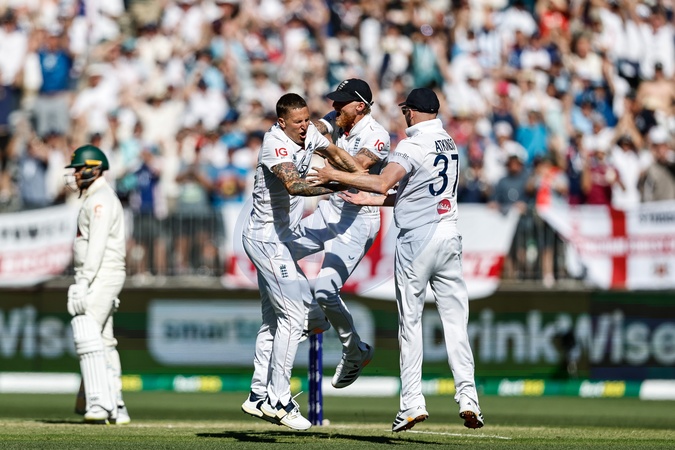 Brydon Carse of England celebrates the wicket of Usman Khawaja of Australia with England captain Ben Stokes during the NRMA Insurance Ashes First Test Day 1 Series Australia vs England at Optus Stadium, Perth, Australia, 20th November 2025, Credit:Santanu Banik/News Images / Avalon