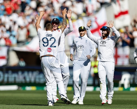 Brydon Carse of England celebrates the wicket of Usman Khawaja of Australia with team mates during the NRMA Insurance Ashes First Test Day 1 Series Australia vs England at Optus Stadium, Perth, Australia, 20th November 2025, Credit:Santanu Banik/News Images / Avalon